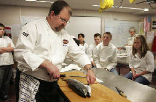 Rover’s Chef de Cuisine Adam Hoffman fillets a farm-raised salmon as Newport High School culinary students watch.