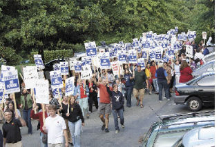Carrying picket signs that read “No Contract? No School!” approximately 800 Bellevue teachers and parents circled the parking lot outside the school district headquarters Wednesday night.