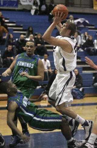 BCC's Blake Pankow goes to the net during the Bulldogs 64-46 victory over Edmonds Community College on Jan. 7 in Bellevue.