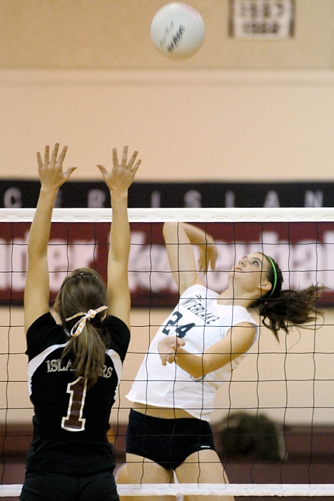 Saints Ashley Maitlen (24) attempts a kill shot at Mercer Island on Tuesday. The Islanders beat Interlake in 3 games — 25-10, 25-19 and 25-16.