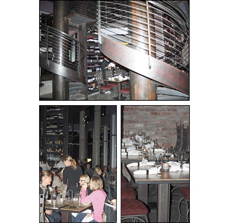 Two oversized steel doors lead the way into the main entry of the new Bellevue facility. Guests are greeted with an industrial interior decor, including metal spiral staircases, brick walls, cement flooring, large pillars and hanging candle light fixtures. The tables throughout the dining area are paired with signature heavy wrought-iron chairs and a single tea-light candle in the center of the table.