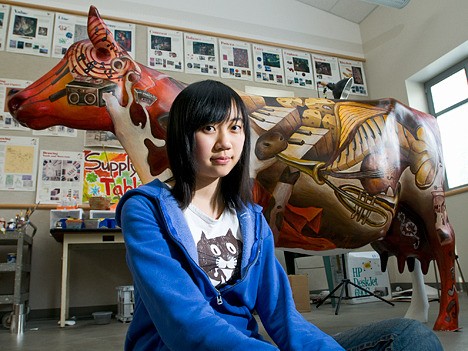 Huang, a junior at Interlake High School, is one of 30 finalists in the Safeway-Lucerne The Art of Dairy Taste of Moo-sic Art Contest. The competition asks for a design which can be painted on a plaster cow and which blends elements of music with a subject that is related to dairy products.