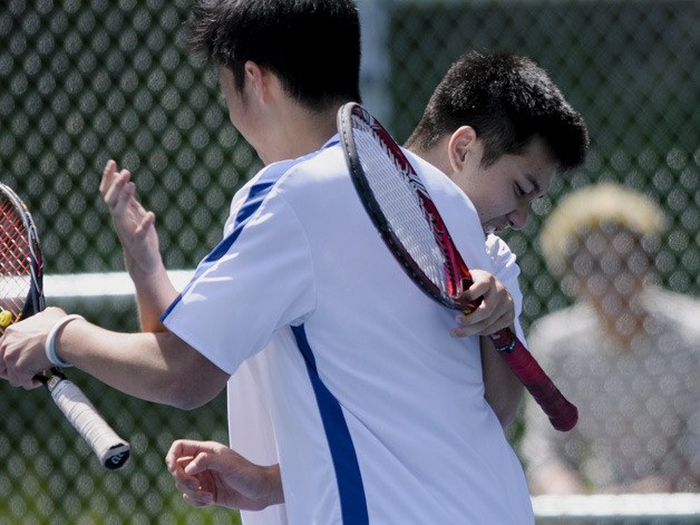 Sammamish's Benny Tran and Andrew Nguyen celebrate together after a win during the Sea-King District doubles tournament on Wednesday. Tran and Nguyen made the finals before falling to the duo from Seattle Prep