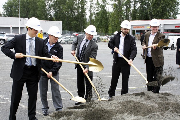 Left to right - Brian Franklin (PMF Investments) Michael Chen (Group Mackenzie) Nat Franklin (PMF Investments) Jason Carey (Barghausen Consulting) John Chelminiak (Bellevue City Council) celebrate the beginning of construction at the Kelsey Creek Shopping Center Thursday morning.