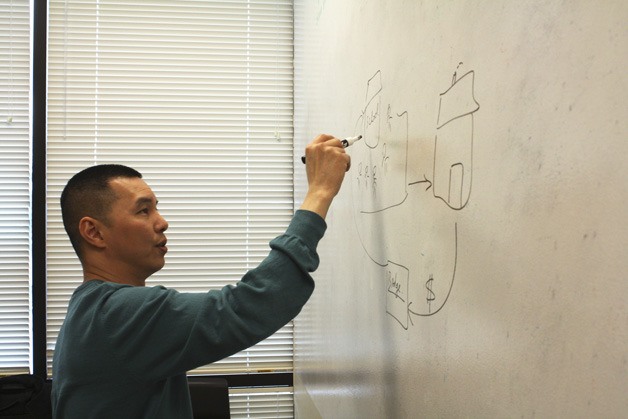 MyCommunityPlace employs 14 people, spread throughout the area, with a couple in California. The company’s small office remains under construction. Wen’s office is bare, with no chairs, and only standing desks. One of the walls has been converted entirely into a whiteboard, with which Wen illustrates his points during meetings.