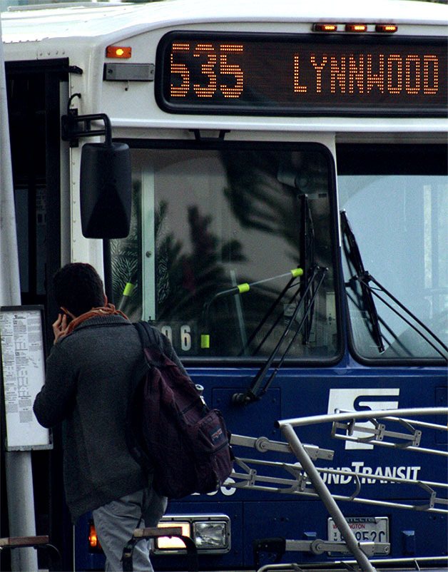 A Sound Transit rider prepares to board a bus at the Bellevue Transit Center on Wednesday (Jan. 15).