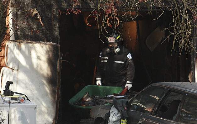 A Bellevue firefighter removes belongings burned in a duplex fire early Monday morning