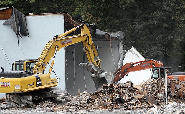 The west building had been leveled and the east was still coming down at the station Tuesday. The current transfer station lacks the space and height to accommodate larger commercial vehicles that were not anticipated when the station was constructed in the mid-1960s, said Doug Williams, a spokesman for the King County Department of Natural Resources and Parks.