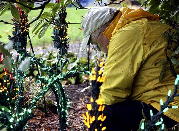 Ward, like most of the 20 volunteers for Garden D’Lights, is a Bellevue retiree who is willing to commit the time to planting light arrangements shaped like flowers, trees and bushes in the botanical garden during the November rain.