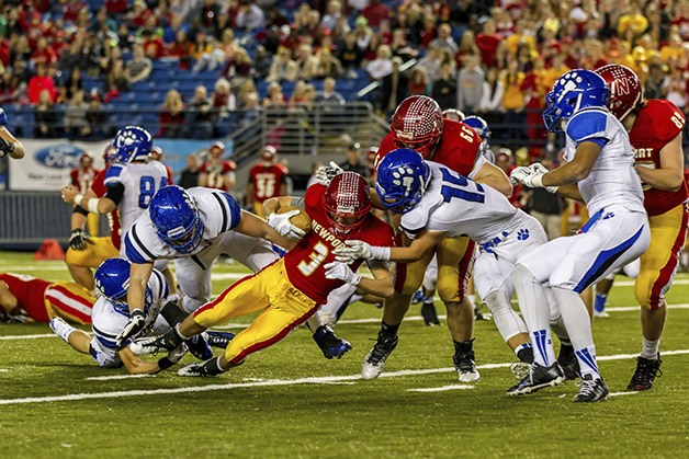 Newport Knights running back Thomas Day battles for extra yardage against the Bothell Cougars in the Class 4A state semifinals on Nov. 29 at the Tacoma Dome.