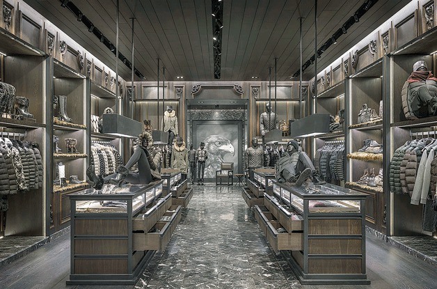 Designed to be unique, the premises are enhanced by chêne fumé French wood panelling. Movement is added by glass and metal inserts used for the display area, and by the carnico grey marble used for the floors. The boutique houses a wide selection of garments from the Moncler and Moncler Grenoble collections — man, woman and accessories — as well as the Moncler Lunettes collection.