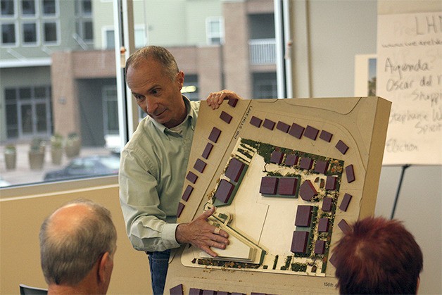 “We took the back side of the grocery store and we buried it underground,” he said, adding the yet-unknown supermarket will have adequate frontage at 156th Avenue Southeast. “We’d like to have a bank, but we don’t want a drive-through,” he added, which has caused problems for a number of bankers. “We really think a drive-through defeats the purpose of what we’re trying to do.”
