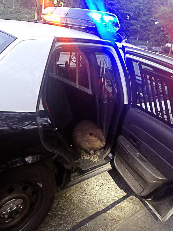 Bellevue Police Officer Seth Tyler said two officers responded to Chick-fil-A on 116th Avenue Northeast, where the beaver was wandering around the restaurant’s landscaping. Police Lt. Andrew Popochock snared the beaver and put in the back of a patrol car.