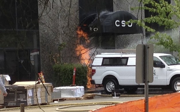 Two plumbers working on a commercial building on the 14300 block of Southeast Eastgate Way were rushed to Harborview Medical Center with severe burns after they accidentally struck a gas line that exploded and caught the structure on fire.