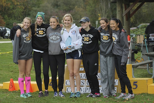 The Bellevue Wolverines girls Cross Country team captured first place compiling 32 team points at the Class 3A KingCo girls meet Oct. 24 at Lake Sammamish State Park. Mercer Island finished in second place with 41 points. Bellevue’s Katherine Penner nabbed first place individually