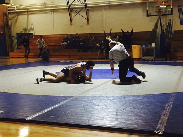 Interlake 132-pounder Kenny Hoang, who pinned Bellevue Christian’s Trevor Paulson in the first round of their match, is ready for the battle against Mercer Island.