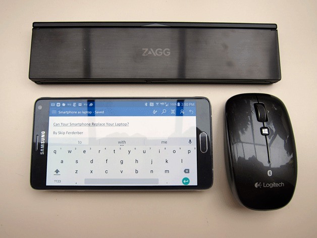 Want some real-world proof? I’m writing this seated at my favorite sushi bar, empty dishes pushed aside and pecking away with my absurd two-fingered typing using Microsoft’s free Word app on my Samsung Galaxy Note 4 Android phone wirelessly connected to my Zagg keyboard and Logitech mouse. Hold on: My spicy tuna roll just arrived. Later.