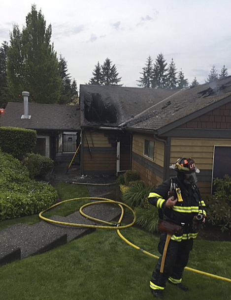 A Bellevue firefighter stands in front of a home on Northeast 35th Street on May 3 after extinguishing a structure fire. A women was rescued from the home, and no injuries were reported.