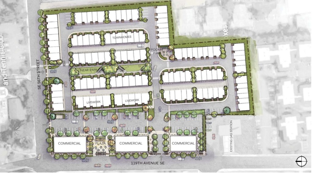 A plan between current owners, RainierNW, and prospective buyers, Intracorp, could turn the 5.9-acre development from “neighborhood business” zoning to “Multifamily-High,” adding 110 townhomes and street-level retail shops fronting 119th Avenue Southeast as the Newport Hills Village.
