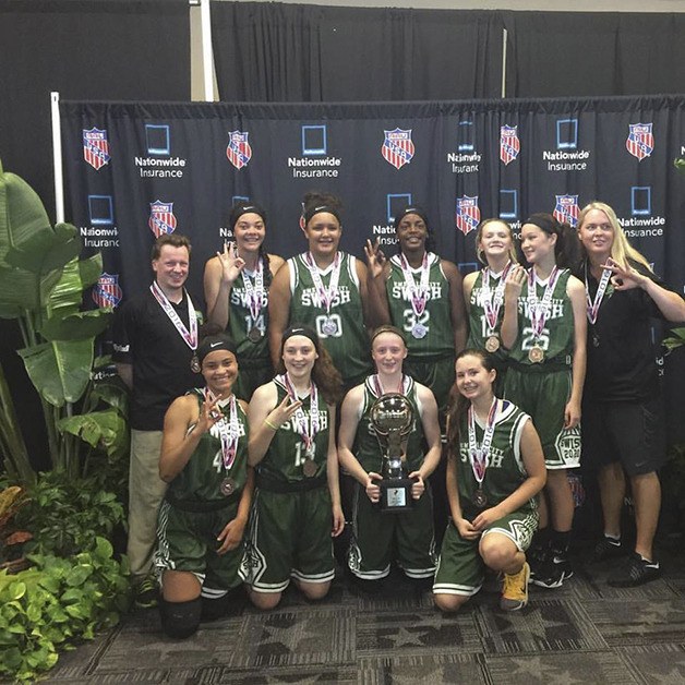 The Emerald City Basketball Academy Swish 2020 girls basketball team, which is based out of Newcastle, captured third place at the eighth grade Amateur Athletic Union Division 1 National Championships on July 13 in Orlando, Florida. The Swish defeated the Arkansas Mavericks 70-48 in the third/fourth place contest. The Swish roster consisted of Bailee Chynoweth, Kiernen Denckla, Amanda Lee, Ariel Winslow, Nakia Boston, Brandi White, Jordyn Jenkins, Dalayah Daniels and Keeli Burton. The team was coached by Keith Wasberg and Cindi Burton.