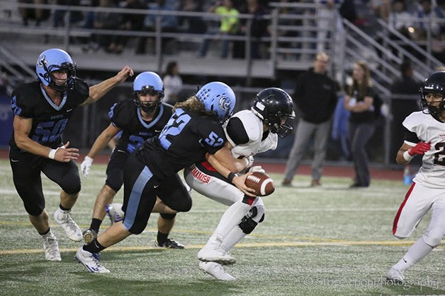 Interlake defensive players Paul Cemarka, Lucas Varela, Blake Hall and Max Collins wreaked havoc on Sammamish’s offense throughout the game. With the Totems’ trailing Interlake 13-0 late in the first half, Interlake left cornerback Michael Veliyev picked off Totems’ quarterback Matt Castle at the Interlake 11-yard line, returning the ball to the Totems’ 45 yard-line to stall the drive with less than a minute to go before halftime.