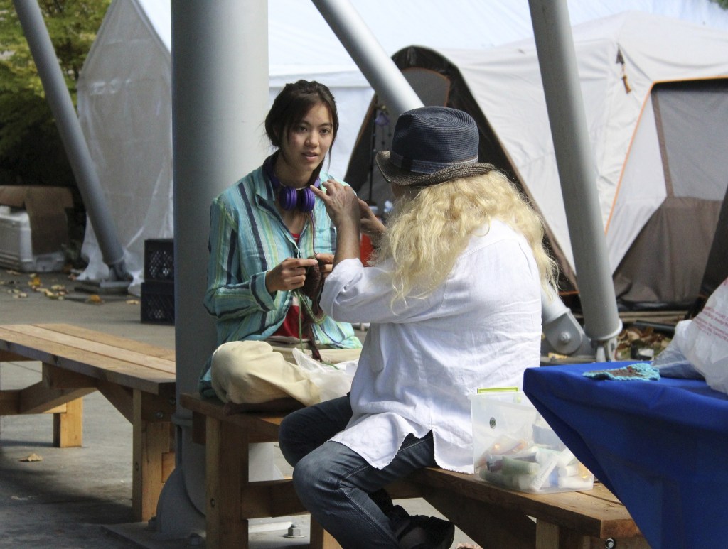 Bellevue School District teacher Daya Astor has spent the last three Sundays at the encampment at Temple B’nai Torah in Bellevue. Each week, she brings a car-full of yarn, colored pencils, magazines, even her grandmother’s crocheting needles for occupants to use in art projects.