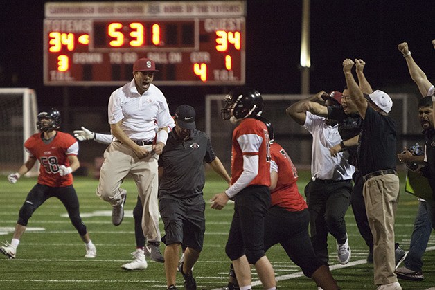 Sammamish Totems football head coach Michael Cooke (Sammamish hat) celebrates after his team ties the game at 34-34 against Chief Sealth on Sept. 16 in Bellevue. Sammamish defeated Chief Sealth 40-34 in overtime.