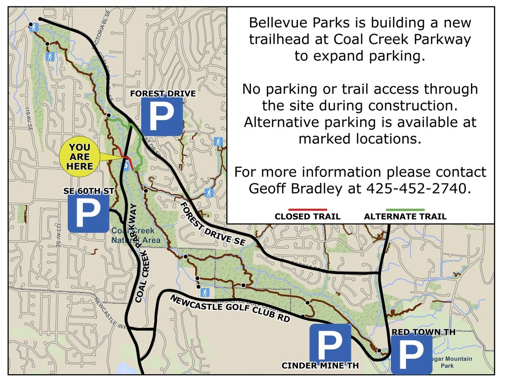 Although the trailhead will be closed, the majority of the Coal Creek trail system will remain open.