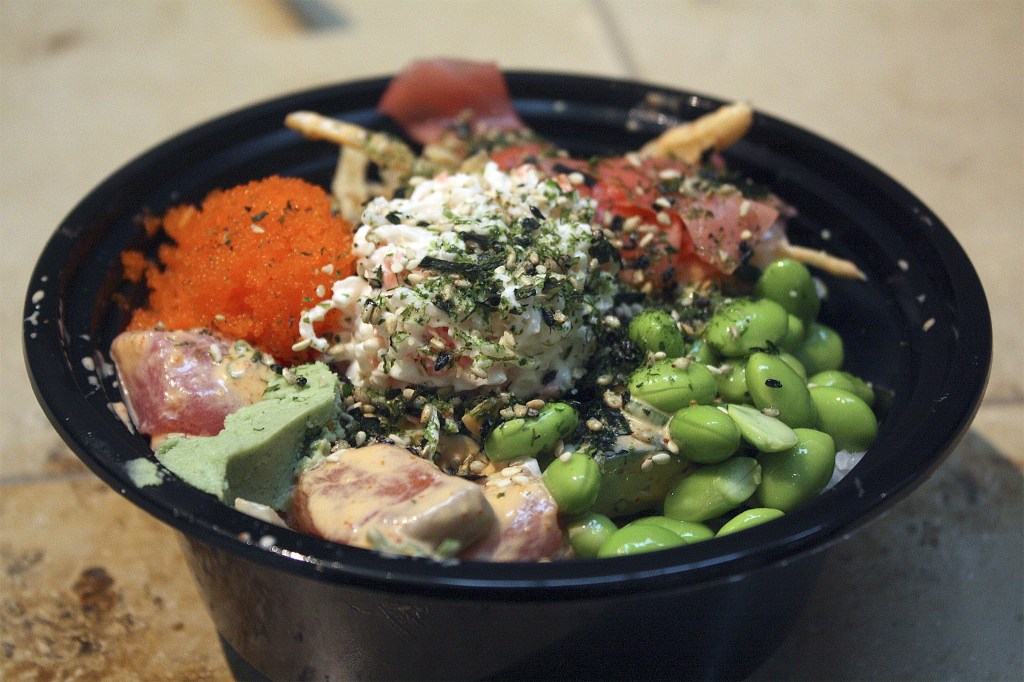 Start with a base (white or brown rice, chips or salad) choose two proteins (tuna, salmon, chicken, shrimp or tofu) add a mix-in like green or sweet onion, sauce it up with miso, shoyu or creamy spicy sauce and then choose from a bevy of toppings such as sesame seeds, masago fish roe, furikake seaweed flakes, pickled ginger, krab salad, avocado, edamame, wasabi or seaweed salad.