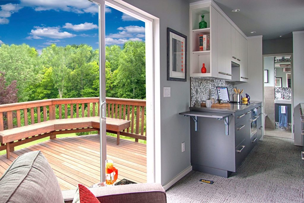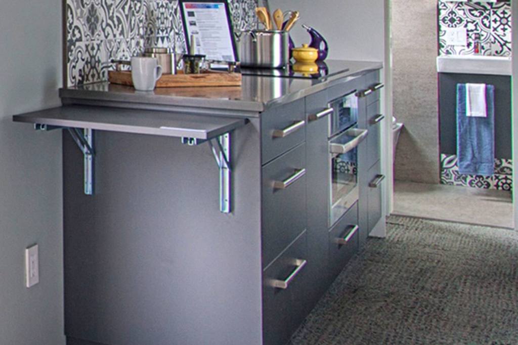 Riem revised his draft proposal several times because of space challenges. A queen bed had to be replaced with a full-sized bed to allocate walking space and a doorway, while the two space-saving sliding doors he had originally included had to be replaced by egress doors that would open inwards or outwards to abide by state safety codes.