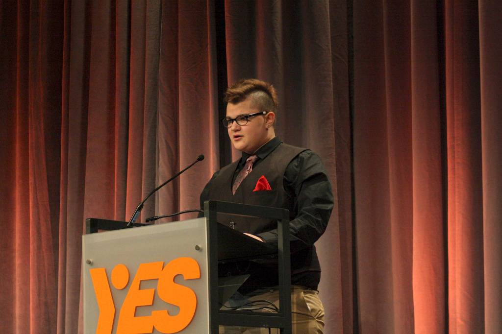 Mason Bernardo stood on stage to read a message he wishes he had written to himself several years earlier, when he was still identifying as female.