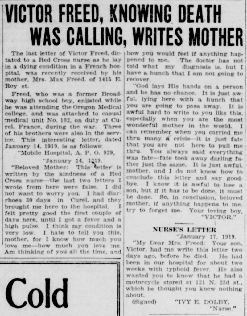 Private Victor Freed died of typhoid after hostilities ended, succumbing to the disease on Jan. 19, 1919.