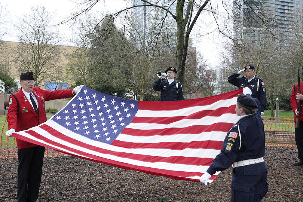 Shay, a color guard and members of local veterans organizations came out in drizzly conditions to offer solemn remembrance of those three sons of Bellevue’s ultimate sacrifice. An honor guard fired blanks in their honor.