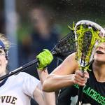 The Issaquah School District girls lacrosse team captured a 19-3 win against the Bellevue Wolverines on April 26 at Robinswood Park in Bellevue. Issaquah improved their overall record 9-1 with the win while Bellevue dropped to 3-5. Issaquah player Julia Hepperle, right, and Bellevue player Kimberly Nickerson, left, battle to gain possession of the ball.