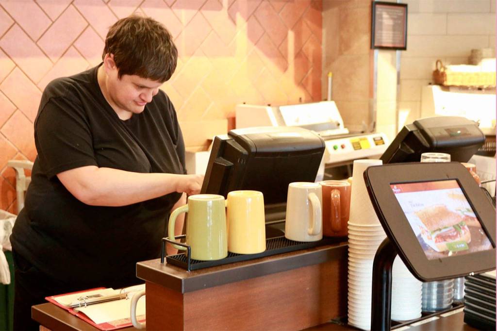 Maslan joyfully greets a co-worker as she washes dishes at work at an Issaquah restaurant where she has worked for over six years. Photo courtesy of Regina Friedland