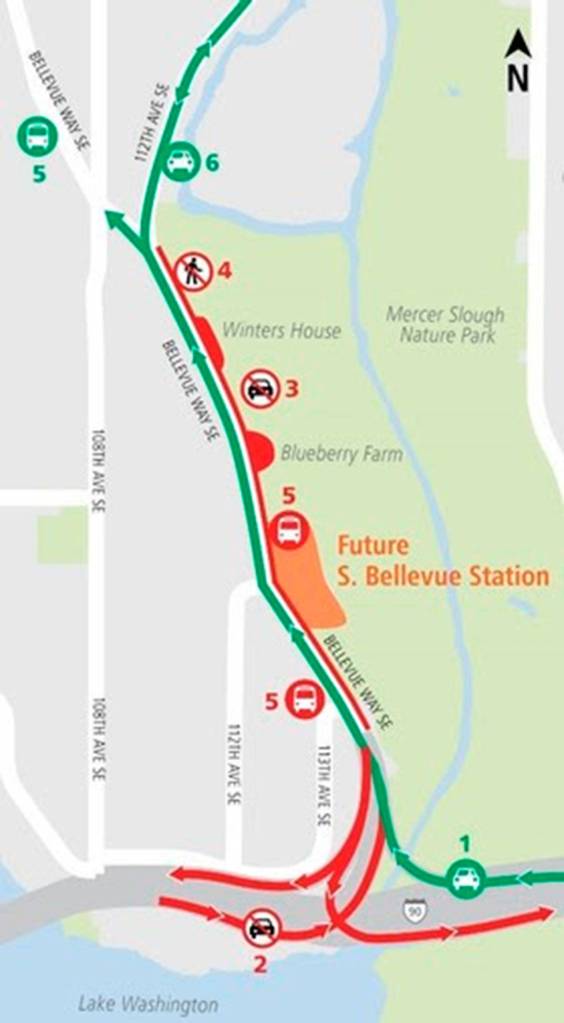 Access from Bellevue Way Southeast to I-90 will be prohibited. The eastbound I-90 ramp to Bellevue Way Southeast will also be closed. Westbound I-90 to northbound Bellevue Way Southeast will be maintained.