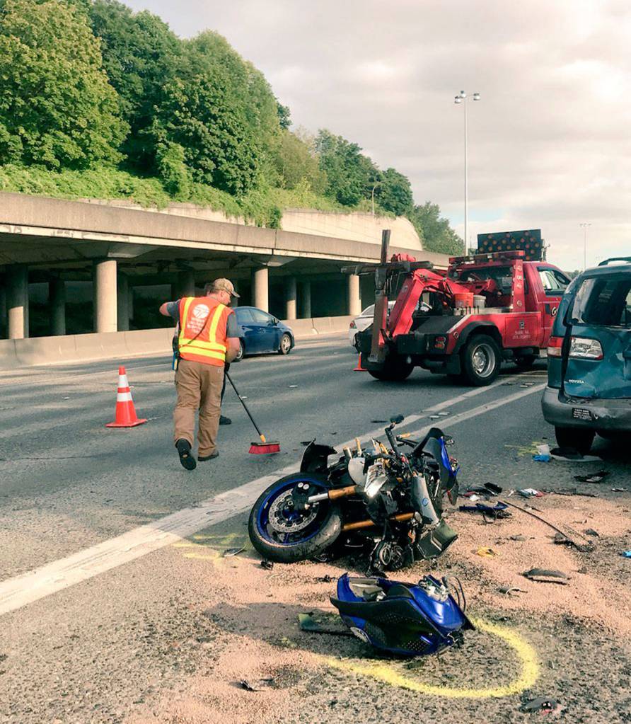 A worker cleans up debris after a motorcyclist died in a collision on Monday on Interstate 5. Photo courtesy of the Washington State Patrol