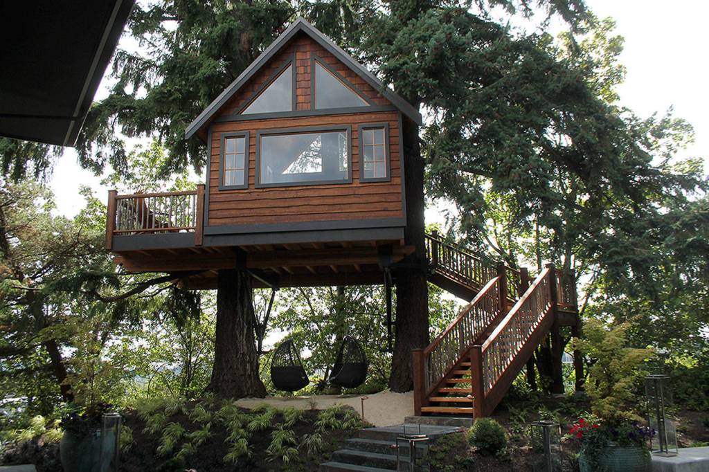 For those who need a break outside, there’s a BBQ and croquet set. The 200-square-foot tree house also features swinging egg-shaped chairs with a sandy ground to rest your feet.