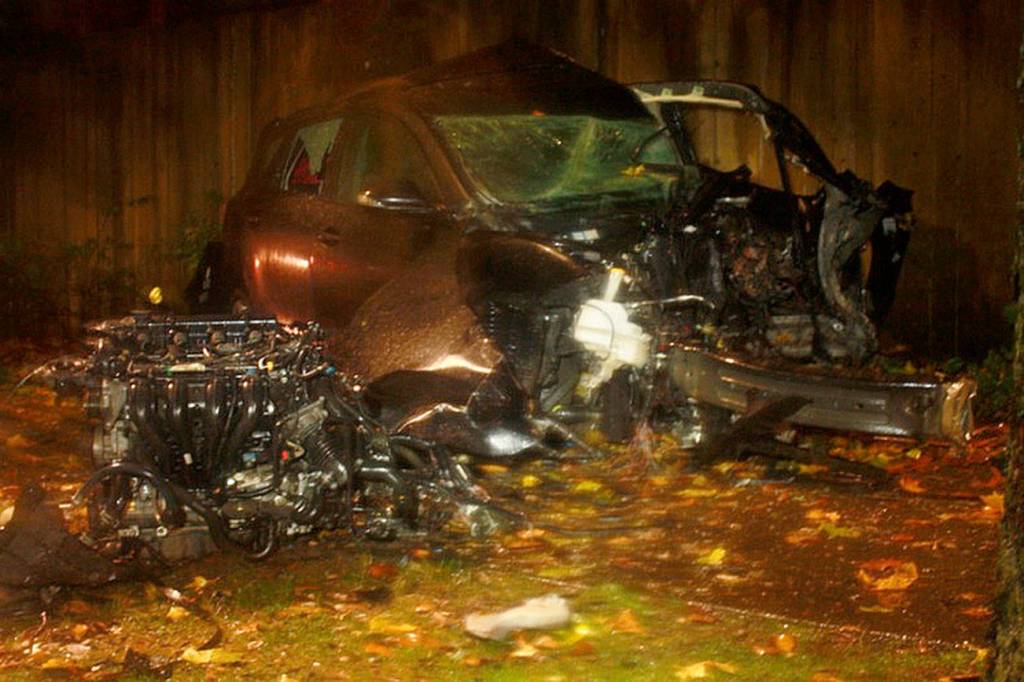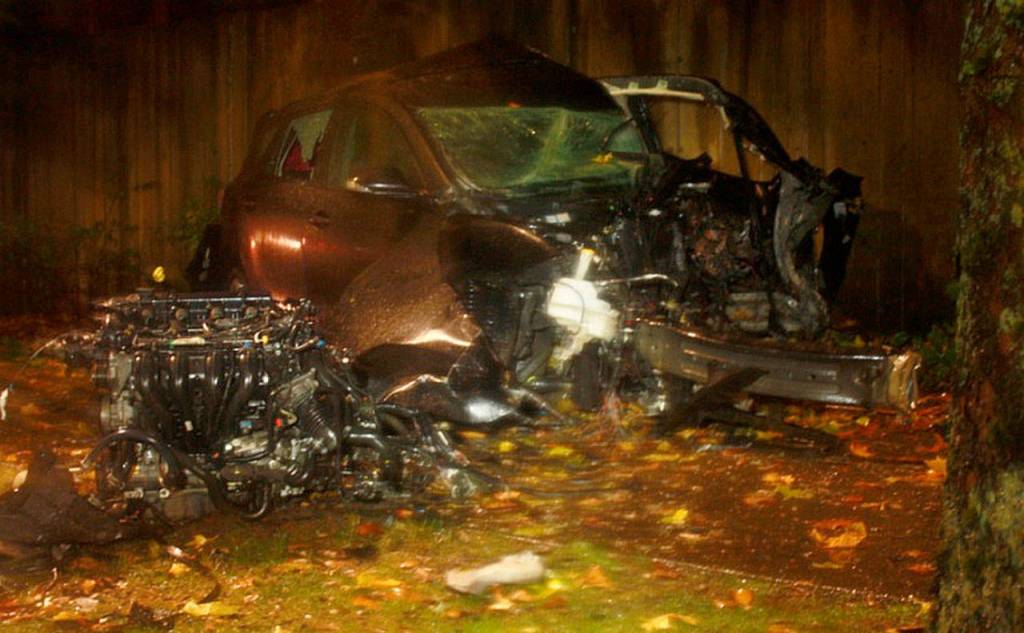 Investigators believe that the vehicle had been traveling at a high rate of speed on the wet roadway prior to the crash. Police believe the driver lost control, and then struck a tree on the side of the roadway, causing the engine to separate from the front of the vehicle.