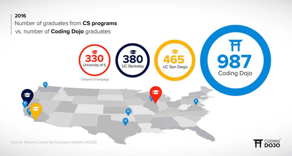 In 2016, Coding Dojo started off the year with campuses in Los Angeles (opened in late 2015), Seattle-Bellevue area and Silicon Valley. It added campuses in Dallas in March, Washington D.C. in June and Chicago in September 2016. The below compares Coding Dojo’s 2016 graduate totals for its original two campuses, Seattle and Silicon Valley, to the 2016 graduate statistics for computer science bachelor’s degrees at the largest computer science programs in those corresponding markets.