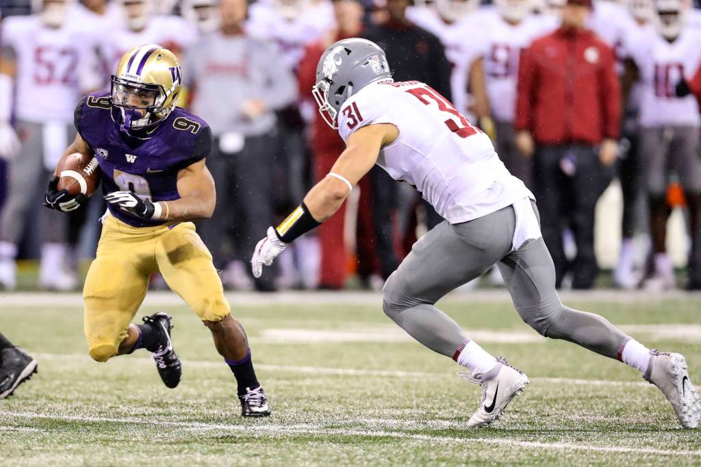 Newport Knights 2013 graduate Isaac Dotson had seven tackles (three solo tackles) for the Washington State Cougars football team against the University of Washington Huskies in the Apple Cup on Nov. 26. The Huskies defeated the Cougars 41-14. Dotson (right), chased Huskies running back Myles Gaskin, left, in the above picture.
