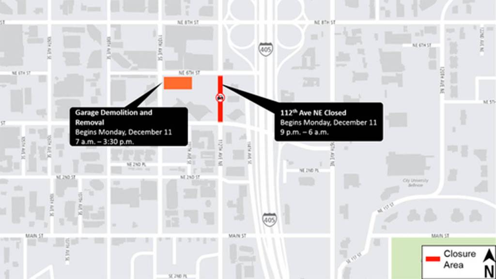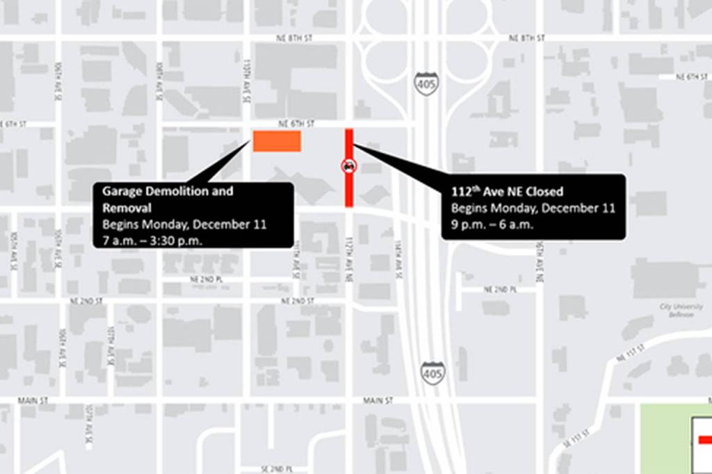 The sidewalk and roadway on 112th Avenue Northeast will be closed between Northeast Fourth Street and Northeast Sixth Street while the work is occurring. From 9 p.m. to 6 a.m., Monday through Friday, signed detours will be in place for motorists, pedestrians and bicyclists. Crews will direct lighting only towards the work site and will have noise control measures in place while the work is occurring. The equipment they use includes generators, cranes, forklifts, lighting, excavators, bulldozers, loaders, trucks, trailers, disposal and recycling containers, and water trucks/street sweepers.