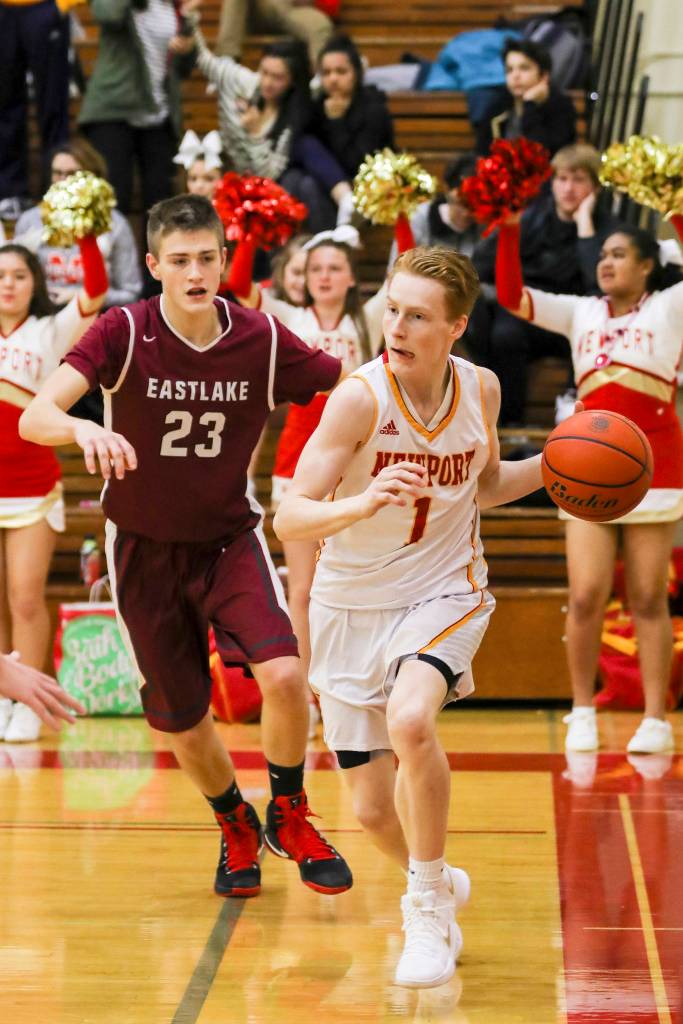 Newport senior Elliot Thompson knocked down two free throws with 12.1 seconds left in regulation, extending Newport’s lead to 42-39. With 1.9 seconds remaining on the clock, Newport senior Benjamin Golan made 1-of-2 free throws, sealing Newport’s 43-39 victory against the Eastlake Wolves in a Class 4A KingCo contest on the hardwood. Newport improved their overall record to 3-0 win the win. Eastlake dropped to 2-3 with the loss.