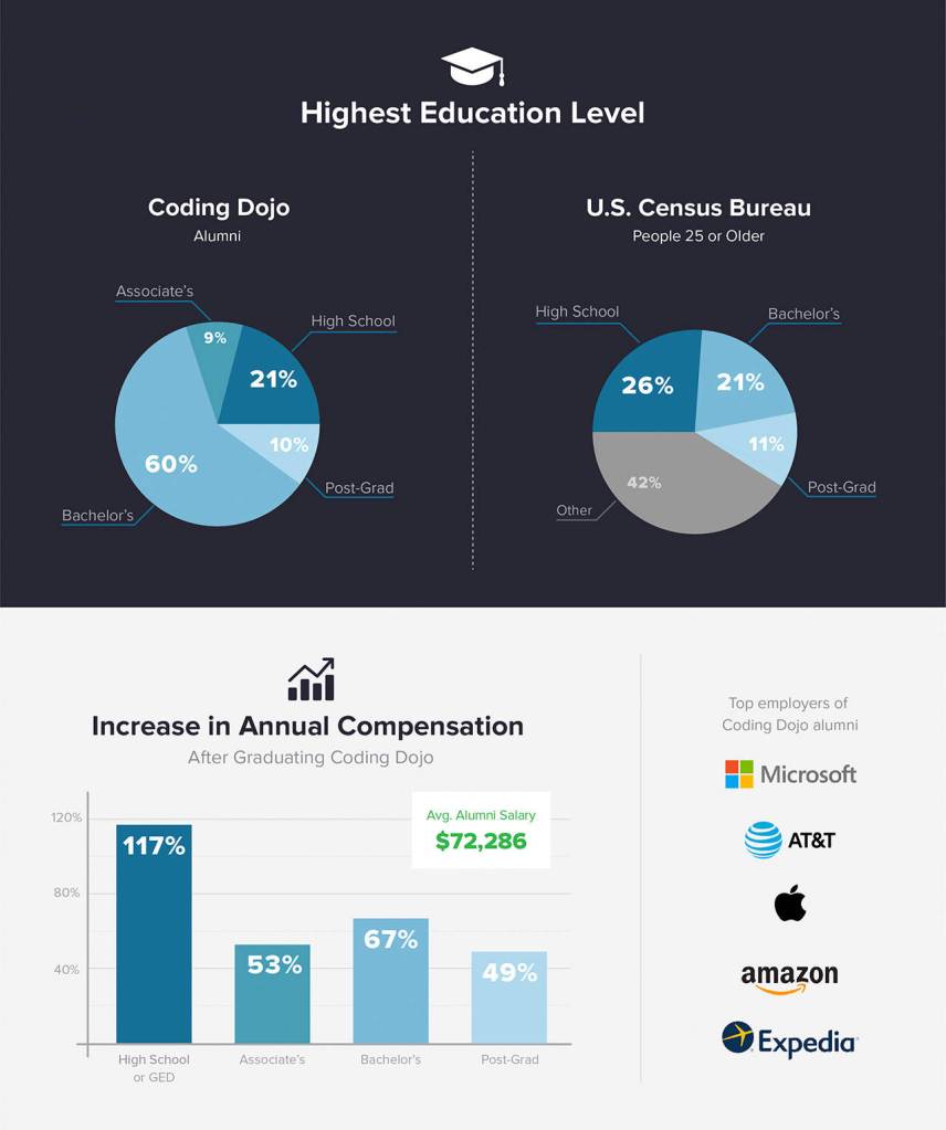 - 60 percent of Coding Dojo graduates began with a bachelor’s degree, in comparison with 21 percent of all Americans 25 or older according to the U.S. Census Bureau.