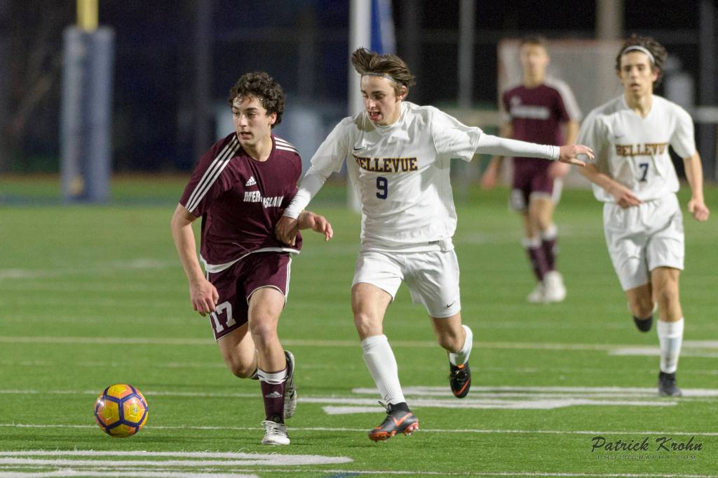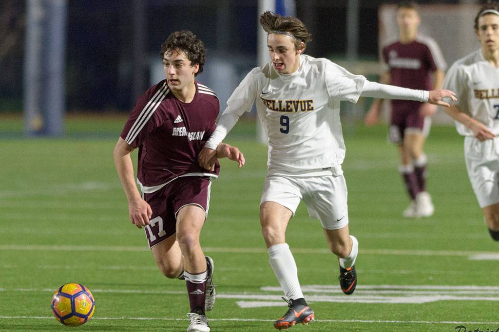 Photo courtesy of Patrick Krohn/Patrick Krohn Photography                                Bellevue sophomore Jed Michael, right, and Mercer Island midfielder Luca Mtskhetadze, left, battle for possession of the ball. Bellevue and Mercer Island battled to a 0-0 tie on March 23 in Bellevue.