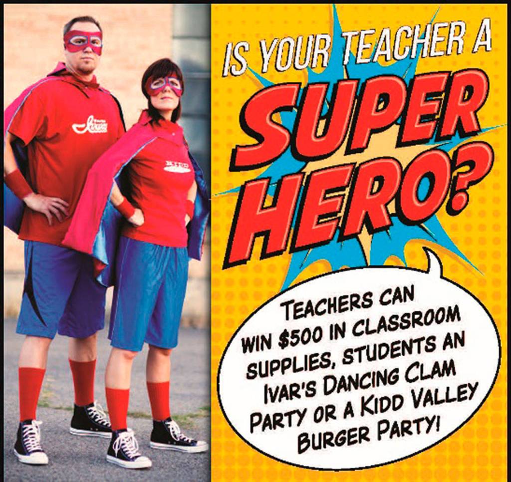 The contest will also award four teachers a first-place prize of a $150 gift card for classroom supplies, and 30 teachers will receive a second-place prize of a $25 Ivar’s or Kidd Valley gift card.