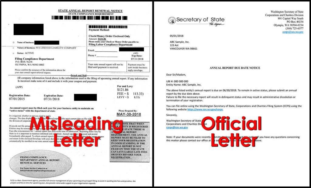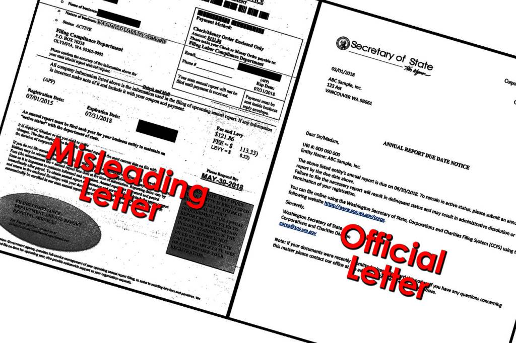 Similar solicitations in the past several years have resulted in an investigation and legal action taken against the senders of the fraudulent letters. Businesses and charities in Washington can always verify their filing status with the Office of Secretary of State by visiting the website, sos.wa.gov/corps. Registration-related questions can be answered at (360) 725-0377 or e-mailed to corps@sos.wa.gov.