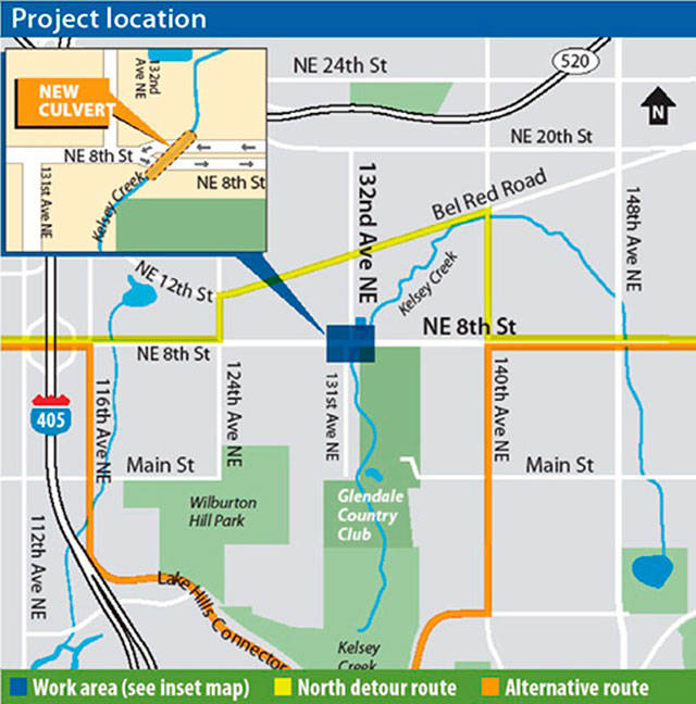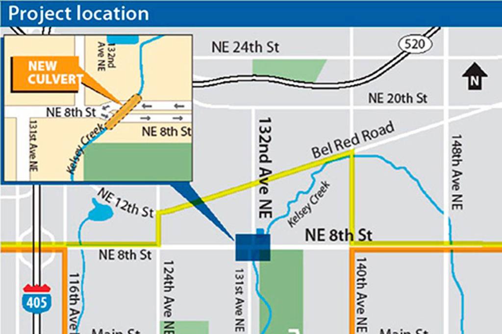 Replacing the culvert will require significant work on Northeast Eighth Street between 132nd and 134th avenues, including: