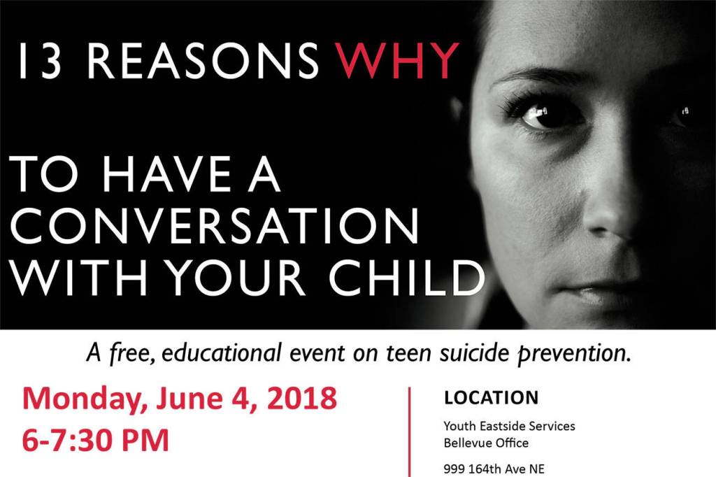 Youth Eastside Services (YES) will host a free educational event focused on preventing teen suicide, titled “13 Reasons Why to Have a Conversation With Your Child”.