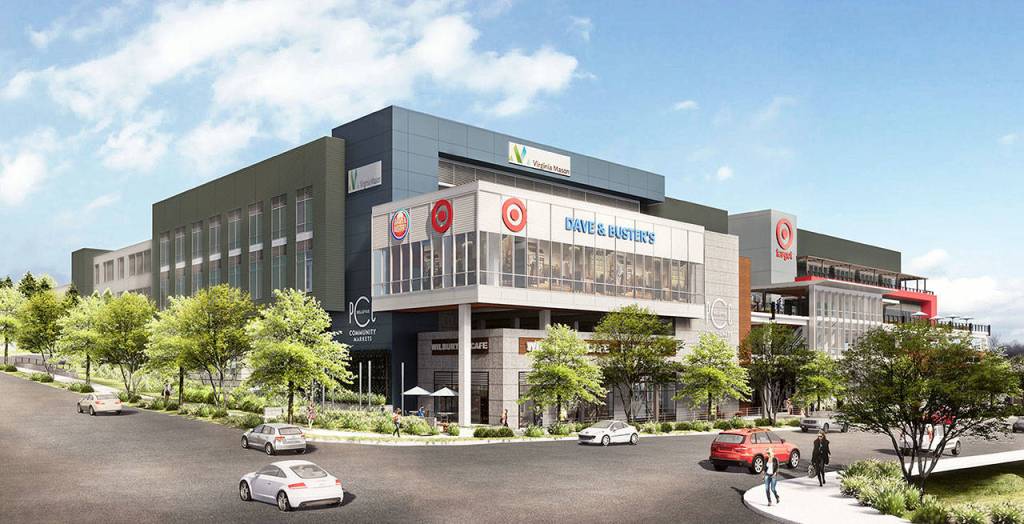 PCC will take up 26,000 square feet on the ground level, marking the co-op’s fourth Eastside location. The small Target will be housed in 49,000 square feet on the third floor along with a Dave & Buster’s and an unnamed tenant. Virginia Mason will take over 45,000 square feet on the fourth floor for its clinic, which will be relocating from its current Bellevue location.